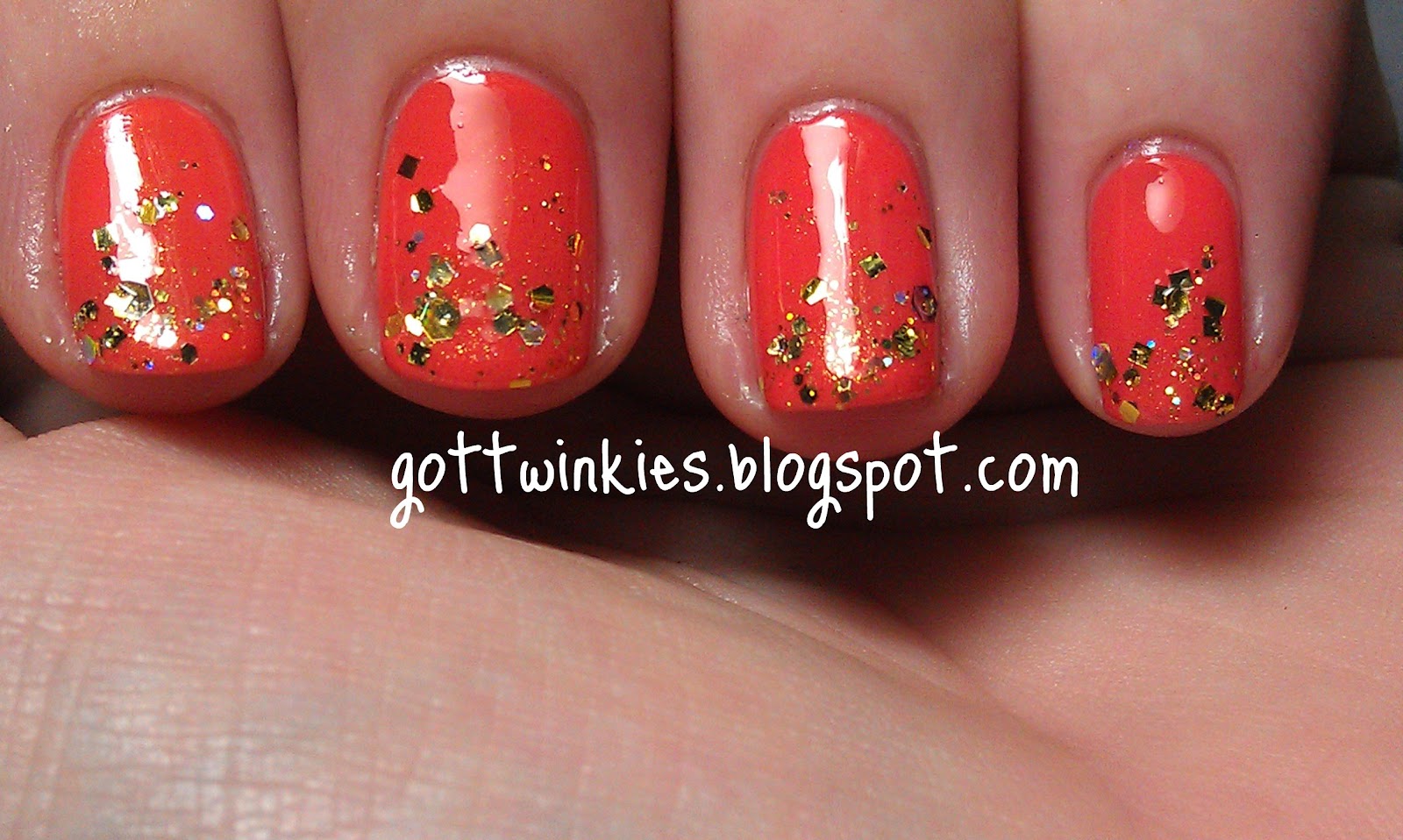 Again, a look at the finshed look, really groovin on the blue and gold sparkles over the melon-y color of Hazard. What do you think-Doesn't it yell, "SUMMER"?